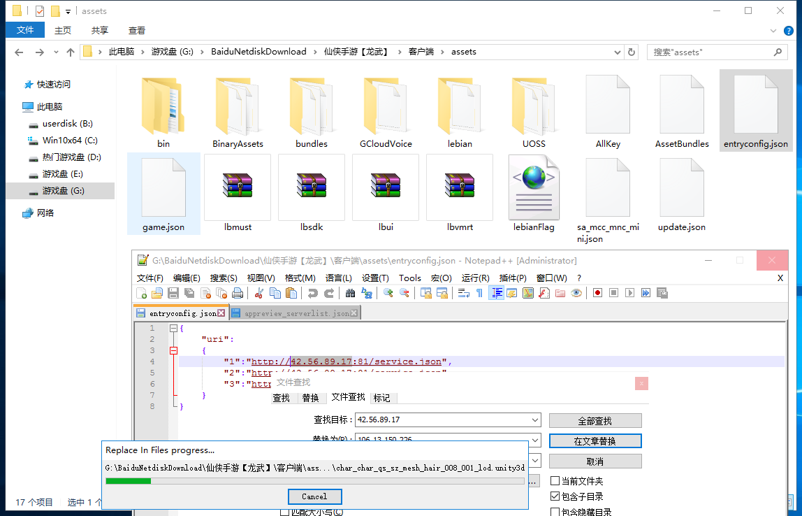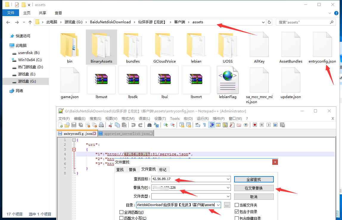找到entryconfig.json文件用N++打开,找到IP修改成自己服务器的IP