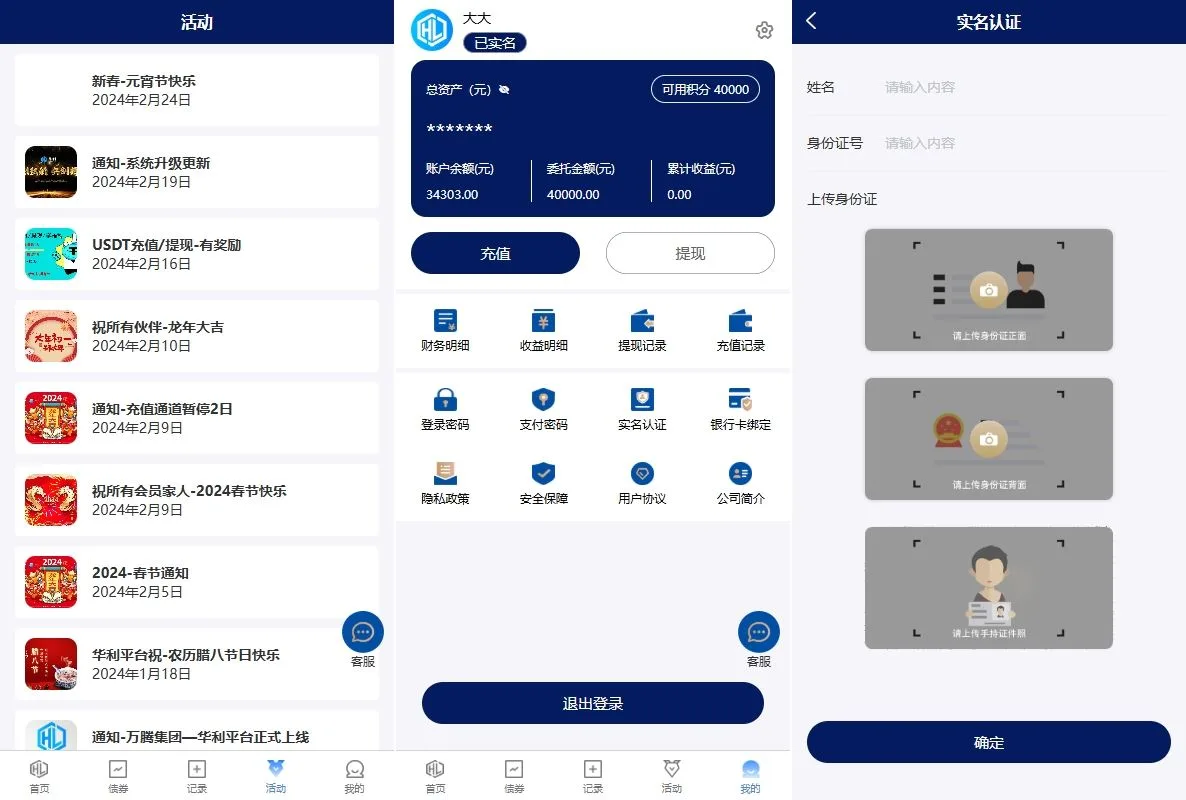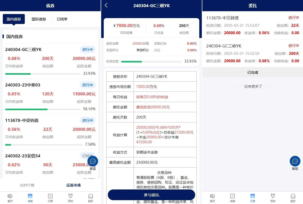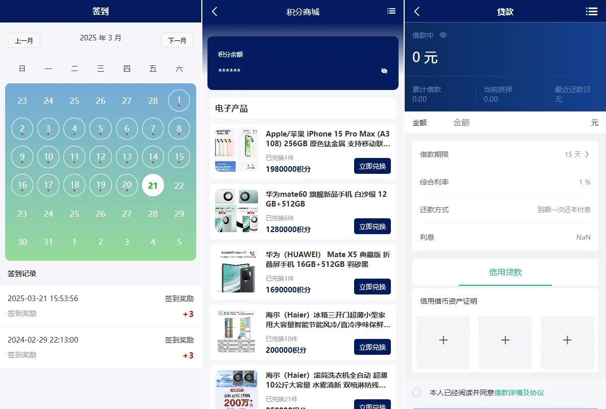 功能支持:债券投资购买、贷款、签到、收益计算器、积分商城等功能